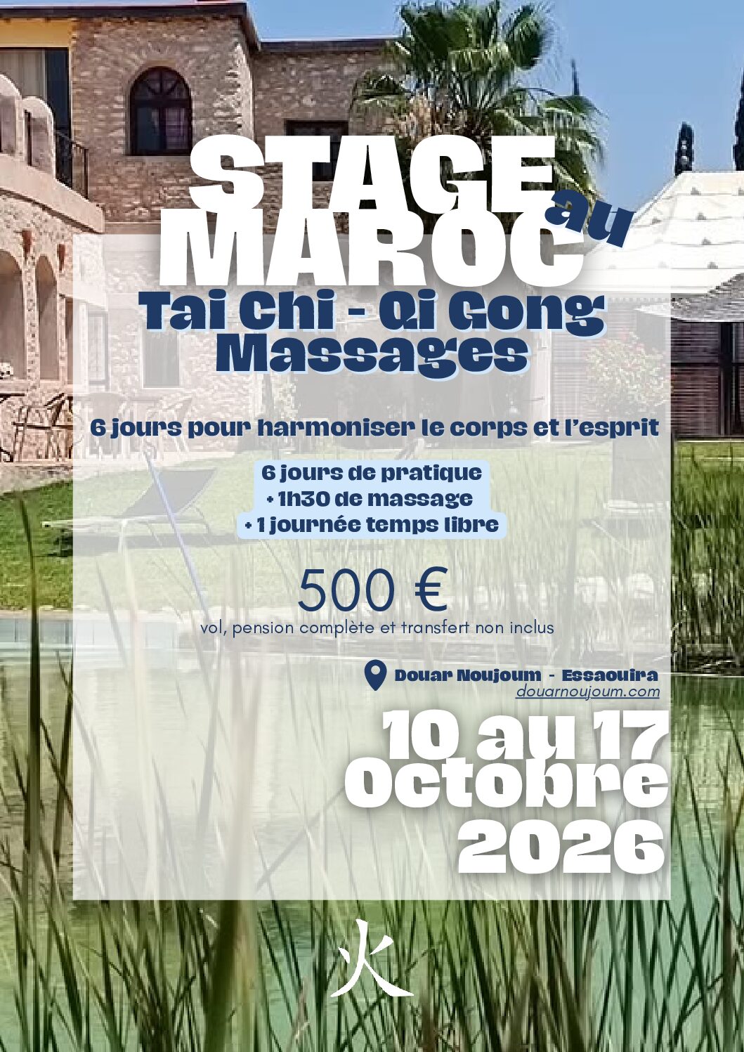 Au programme : Tai Chi & Qi Gong, relaxation profonde, découvertes, lâcher-prise… et un massage personnalisé de 1h30 réalisé par mes soins.